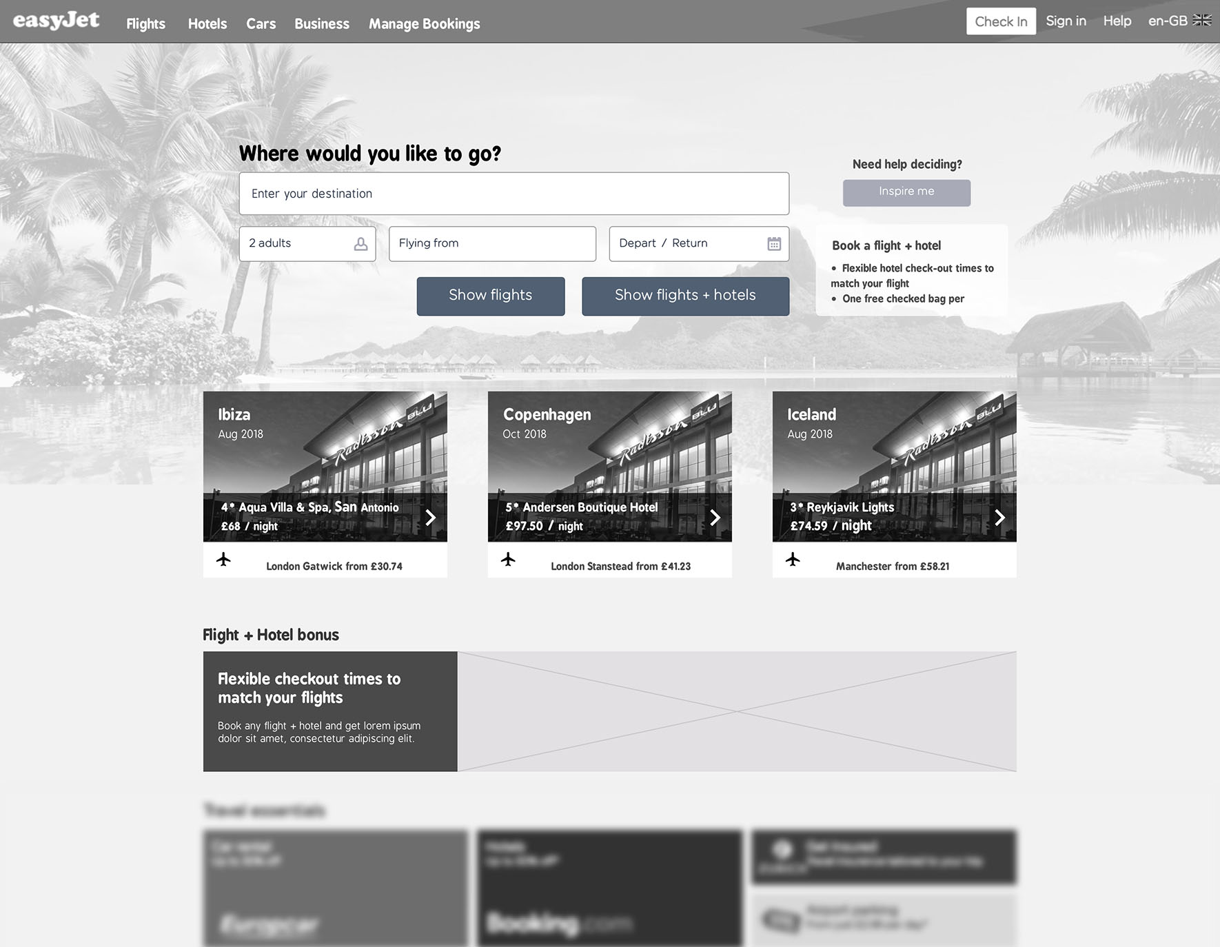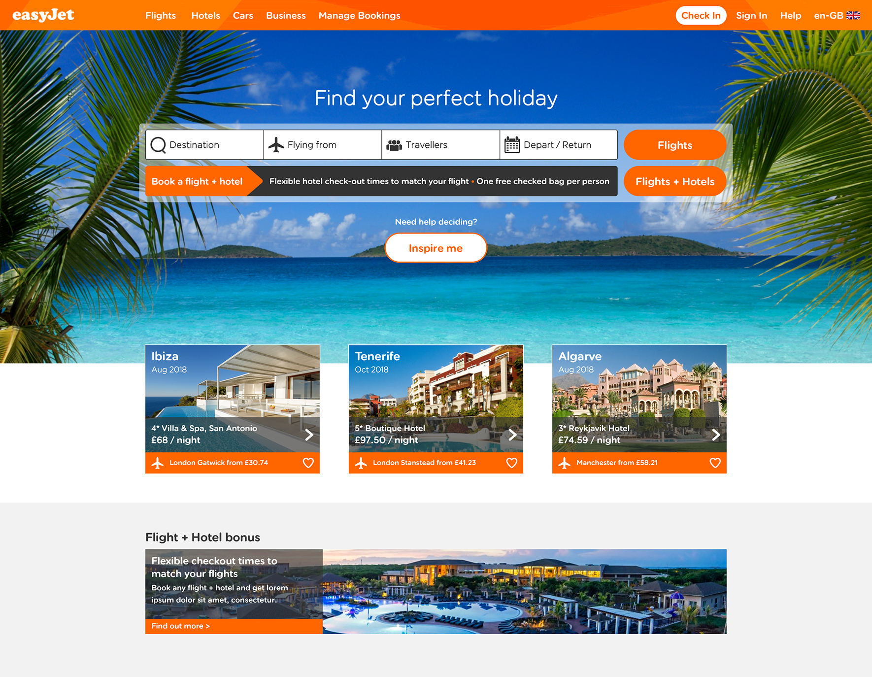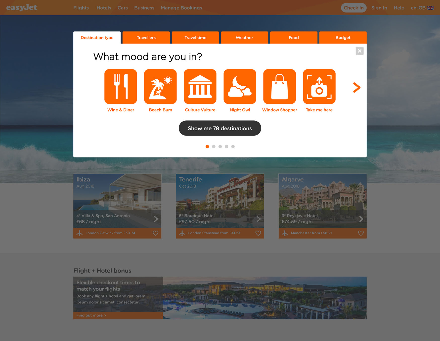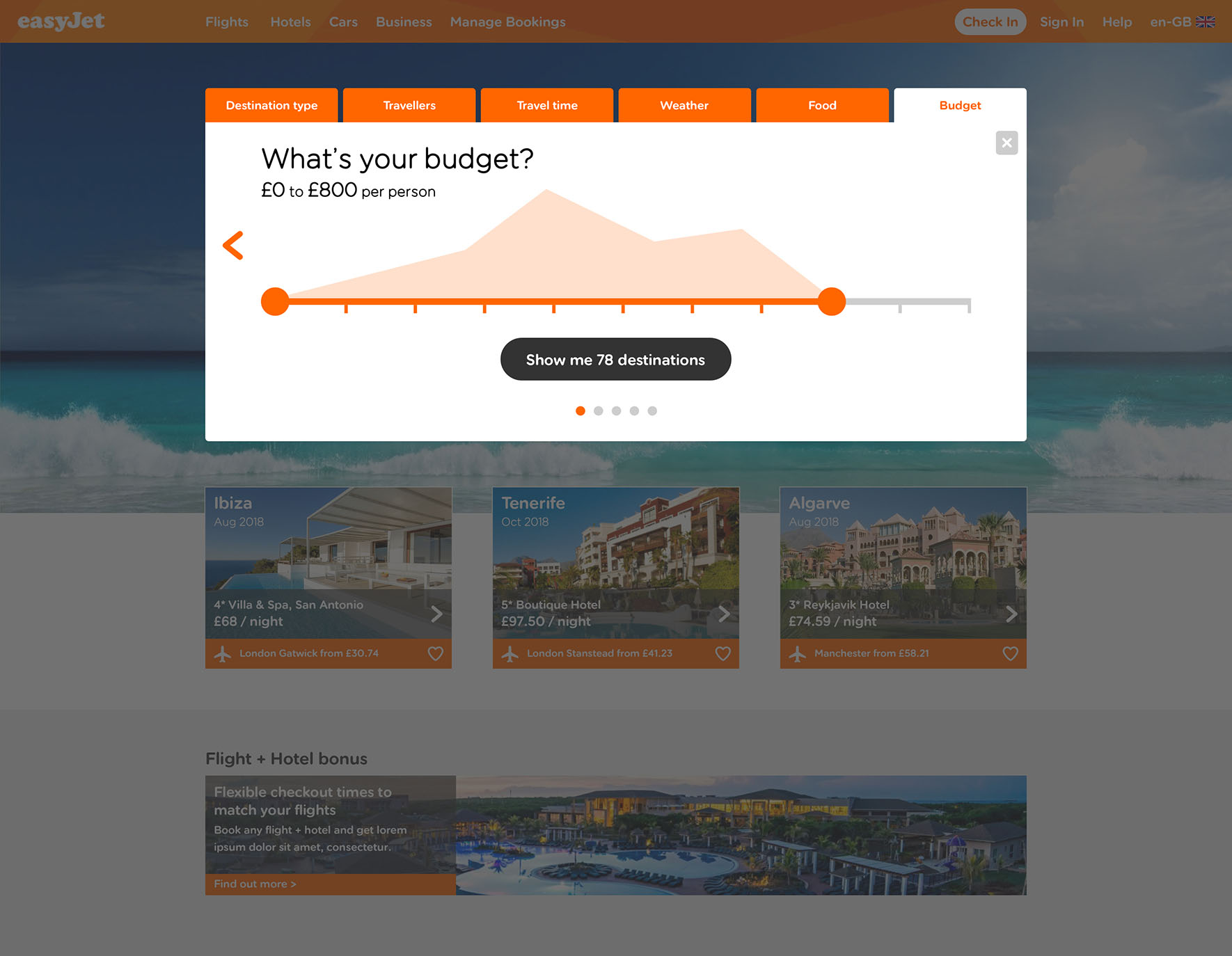 Challenge Increase conversion by adding functionality that allows hotels to be booked along with flights. Increase user engagement by presenting inspirational holiday destinations based on the users individual preferences.
