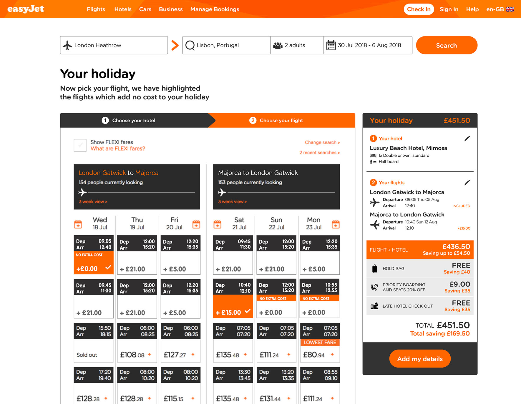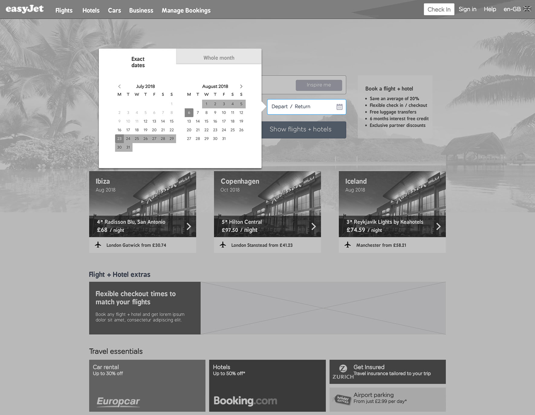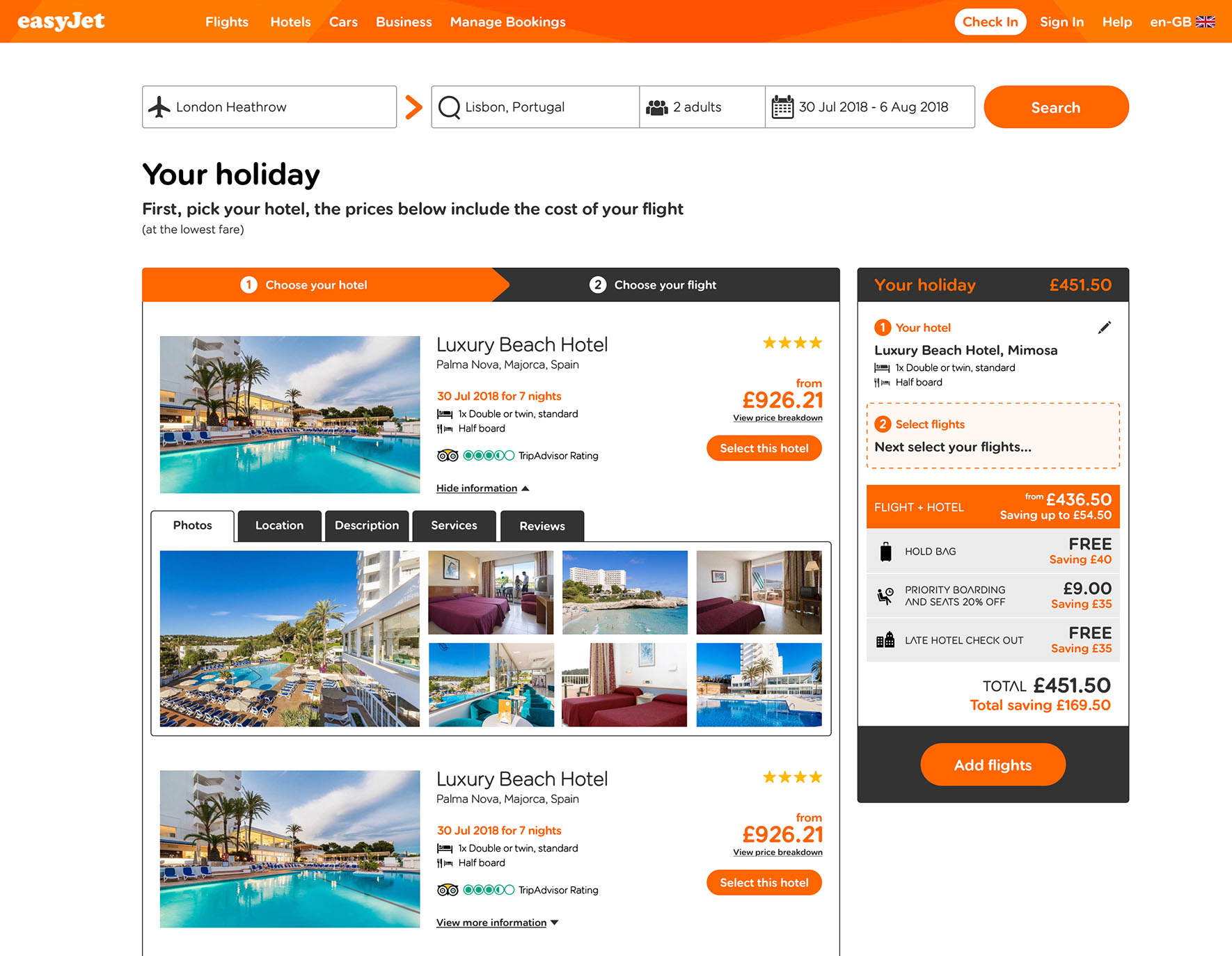 Solution In the search area of the homepage a button was added to allow users to search for both flights and hotels based on their search criteria. Positive messaging was added to promote the new functionality. On click the user is taken to a hotel listings page and instructed to first pick their hotel. The prices displayed also include the cost of the flights at the lowest fare. Once a hotel has been selected the user is then directed to add flights to their holiday. After passenger details have been added, the user continues to checkout.