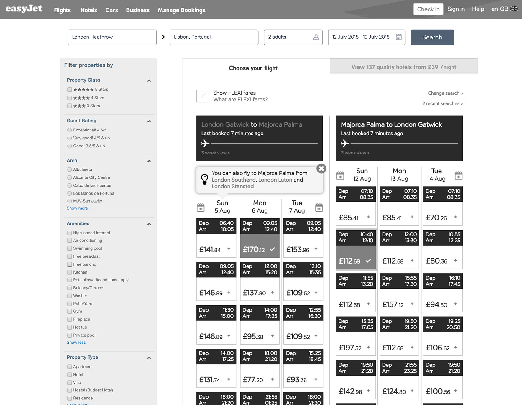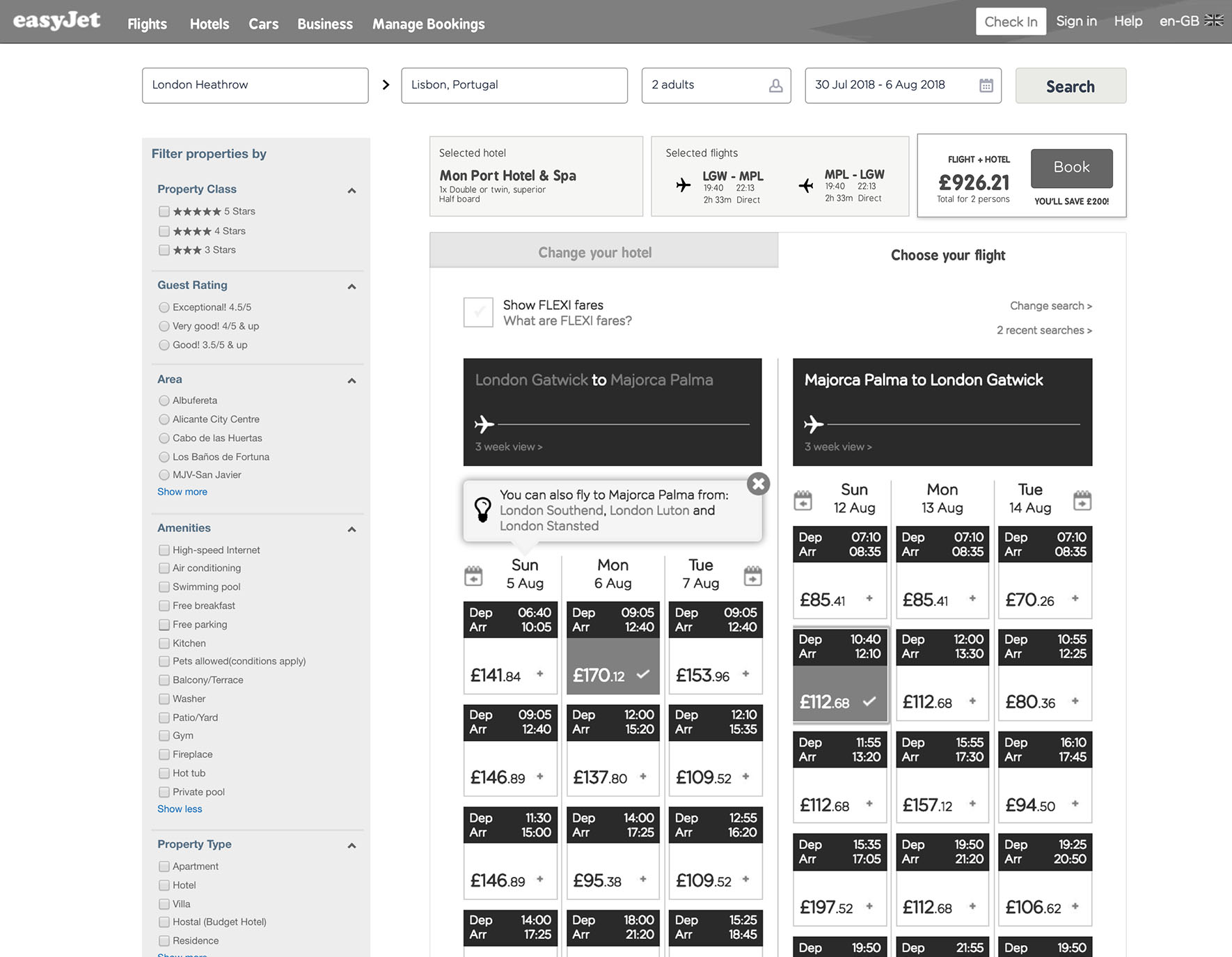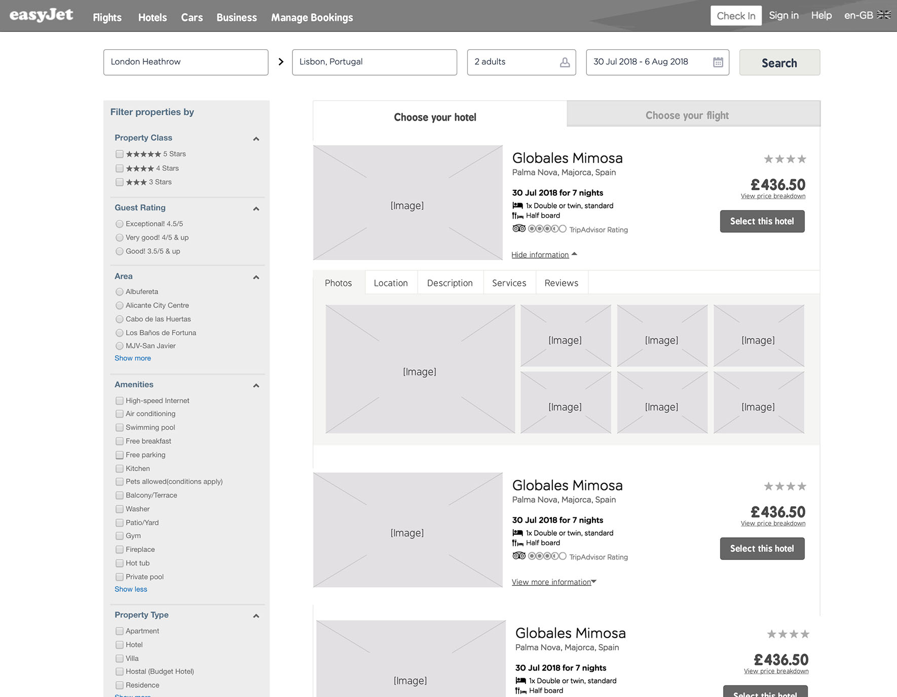 Solution In the search area of the homepage a button was added to allow users to search for both flights and hotels based on their search criteria. Positive messaging was added to promote the new functionality. On click the user is taken to a hotel listings page and instructed to first pick their hotel. The prices displayed also include the cost of the flights at the lowest fare. Once a hotel has been selected the user is then directed to add flights to their holiday. After passenger details have been added, the user continues to checkout.