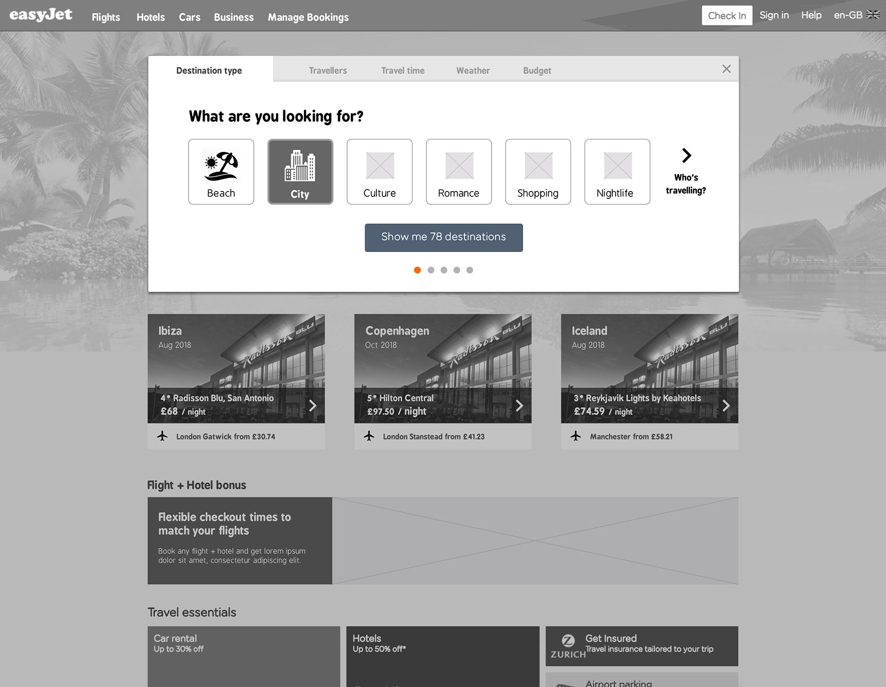 In addition to the new hotel booking functionality, an ‘Inspire Me’ button was also added to the search section to help users who might be unsure of where they would like to go for their holiday. On click, the user is presented with the option to view a number of random destinations. These destinations are then narrowed down by allowing users to define their holiday requirements, such as ‘Destination Type’ and ‘Budget’. Once the user has selected their preferences they can view the shortlisted destinations by clicking a button.